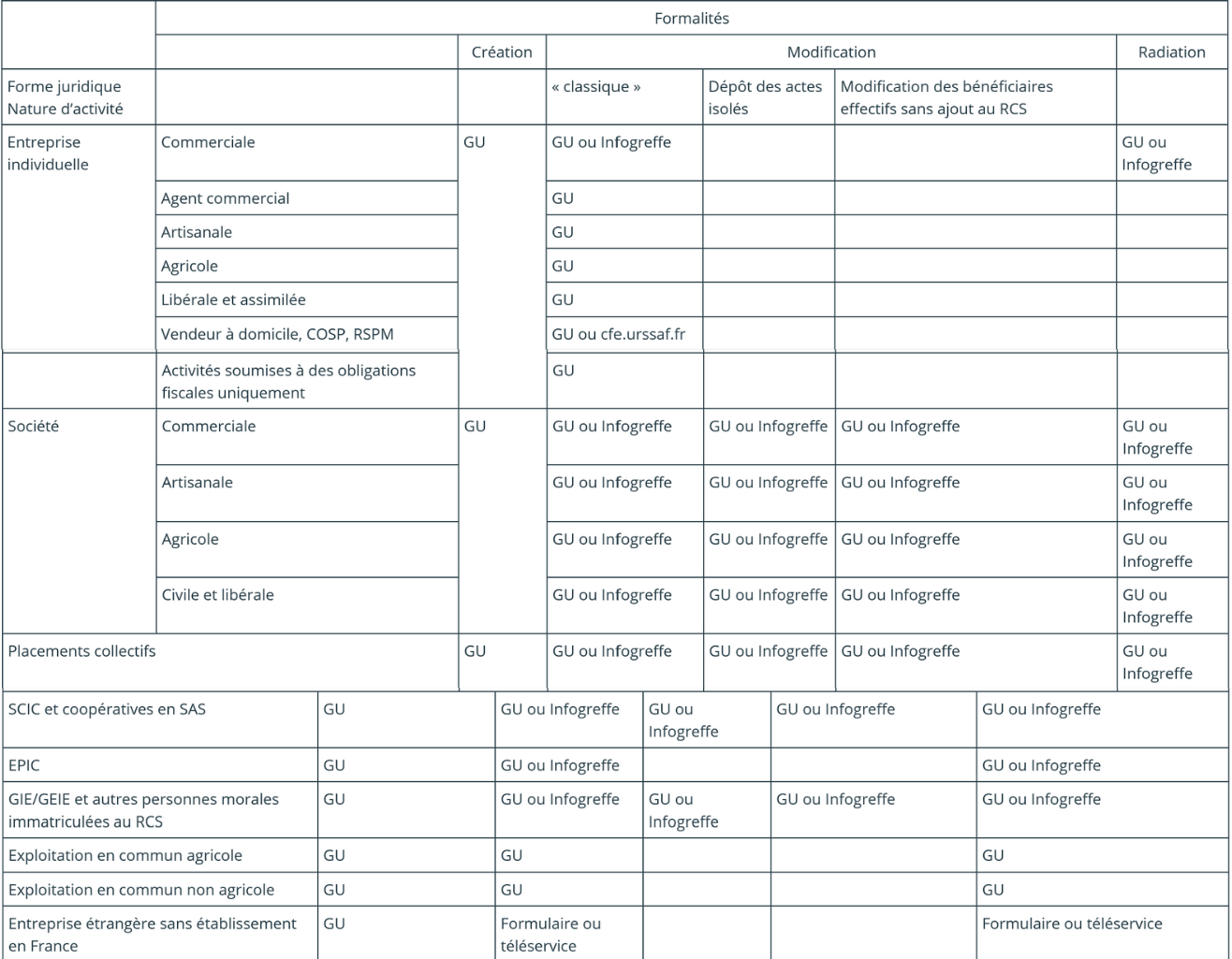 Le tableau ci-dessus, extrait de la foire aux questions du guichet unique, synthétise les modalités de dépôt dorénavant disponibles selon le type de formalités.